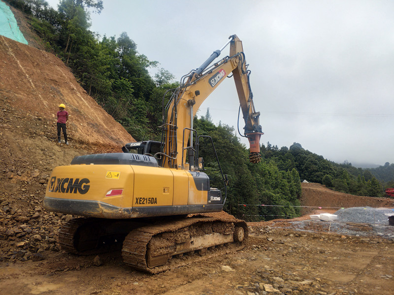 廣西省河池市天巴高速鳳山段內,一臺恩特AD-10RD型縱向銑挖機安裝在徐工XE215型挖機上,正在對高速公路兩旁的邊坡進行精準開槽。