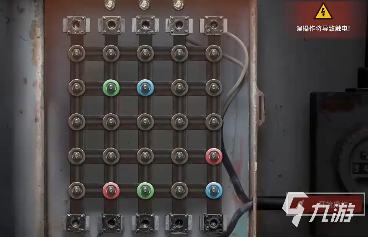 進(jìn)去之后大家會發(fā)現(xiàn)一個(gè)中央控制臺,需連接紅、綠、藍(lán)三色電路線。紅色就對應(yīng)著左側(cè)三角形接口,綠色就對應(yīng)著右側(cè)圓形接口,藍(lán)色就是中間立柱方形插槽。另外還要進(jìn)行并聯(lián)線路處理,優(yōu)先拆解主干線路(較粗的金屬管),使用電路探測儀(人形怪掉落)掃描電流走向。