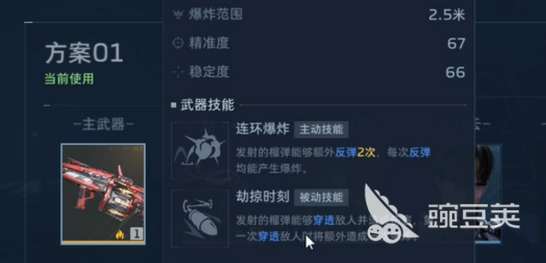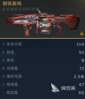 先看看基礎數據,單發(fā)傷害149,射速92,彈夾容量13發(fā),總彈量72發(fā),爆炸范圍2.5米。精準度67,穩(wěn)定度66,這個數值說實話不算特別出眾,但配合上它的技能之后,傷害輸出能力就完全不一樣了。主動技能叫連環(huán)爆炸,發(fā)射出去的榴彈可以額外反彈2次,關鍵是每次反彈都會產生爆炸。被動技能劫掠時刻更夸張,榴彈可以穿透敵人造成傷害,而且第一次穿透的時候會額外引發(fā)一次爆炸。