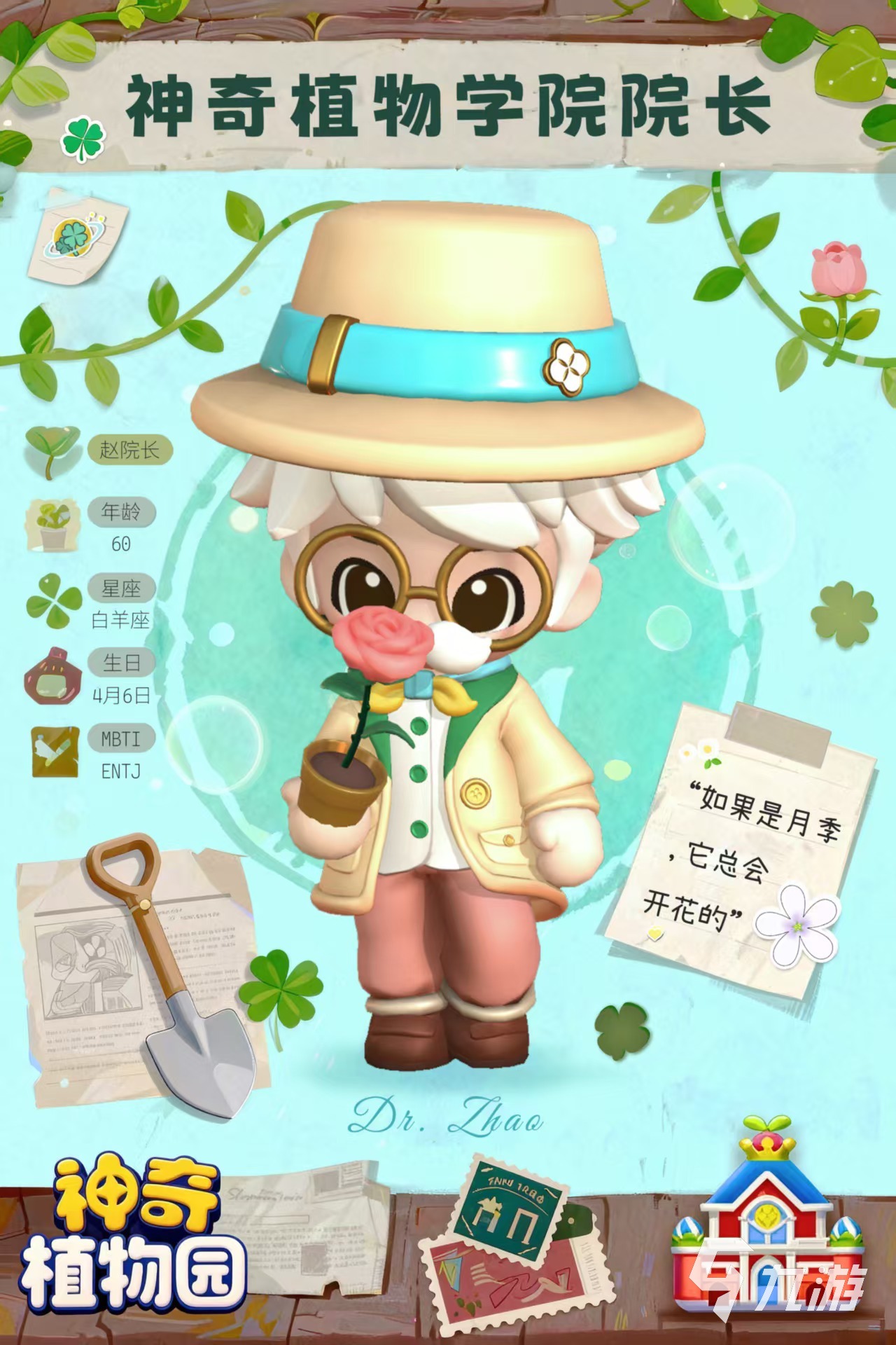 趙院長(zhǎng)擁有植物學(xué)和生態(tài)學(xué)雙學(xué)位,是一個(gè)真正的大學(xué)者,他的夢(mèng)想是未來(lái)培養(yǎng)出更多優(yōu)秀的植物學(xué)家,作為學(xué)院中最年長(zhǎng)的角色,總是樂(lè)觀的鼓勵(lì)每一個(gè)學(xué)生。大家在游戲中的很多互動(dòng)以及活動(dòng)都是和趙院長(zhǎng)相關(guān),他雖然不是商店的NPC,但也給玩家的游戲提供了很多幫助。
