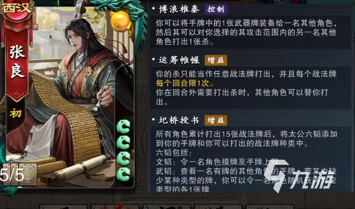 第四個(gè)就是張良,張良是一個(gè)群攻類型的角色,他使用的殺可以當(dāng)作戰(zhàn)法牌,對全體造成傷害,這個(gè)戰(zhàn)法牌也可以變成一些特殊的功能牌,但是每個(gè)回合限用一次,所以需要根據(jù)上場情況,靈活變化卡牌效果,自由度很高,并且還有一個(gè)特殊的保護(hù)效果,也就是要求自己打出殺的時(shí)候,可以要求另一名角色代替自己,否則就會承受相同的效果。