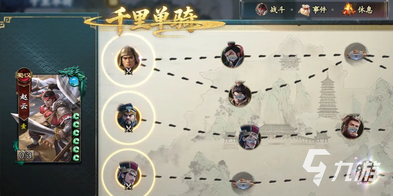 千里單騎是特有的單人闖關(guān),模式分為8個(gè)難度等級(jí),初始為壹,最高為捌順利通關(guān)前一難度才能解鎖后續(xù)的,難度每提升1級(jí)遇到的敵方武將的總屬性會(huì)加2,每次挑戰(zhàn)的時(shí)候地圖隨機(jī),地圖還會(huì)被分為3個(gè)不同類型的節(jié)點(diǎn)。