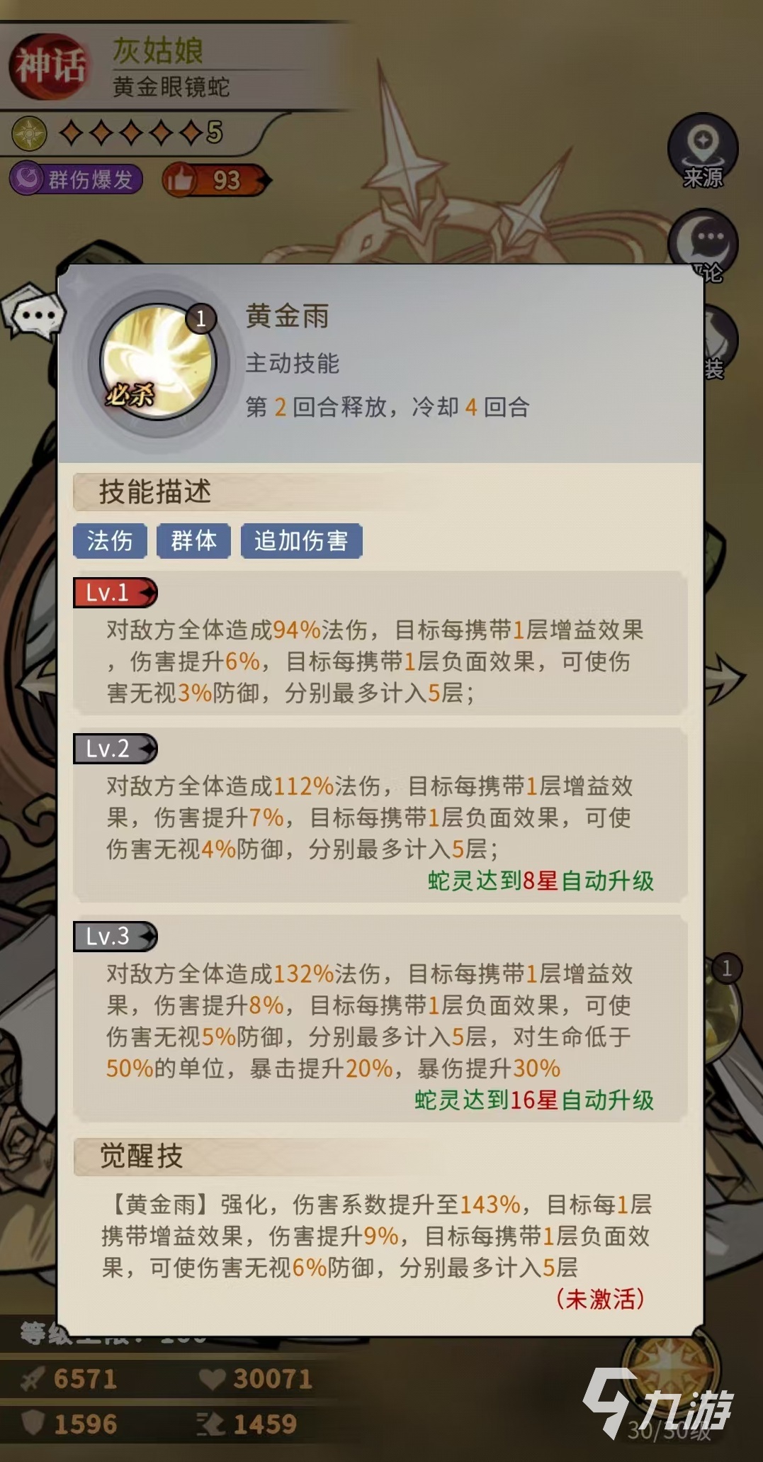 在游戲的定位中,灰姑娘是屬于群傷爆發(fā)類型,她作為神話角色擁有兩個主動技能和兩個被動,在屬性方面就要比其他的角色更強一些。先來簡單看一下技能特點,主動技能星光璀璨,對敵方全體造成高額法傷,傷害由所有的目標共同承擔,還有幾率給目標附加日蝕效果。對方被影響后攻擊和命中都會大幅度降低。覺醒之后該技能獲得強化傷害系數(shù)提升,對攻擊低于自身單位造成的傷害提升。第二個主動技能,繼續(xù)對敵方全體造成法術(shù)傷害,目標身上攜帶的增益效果越多,傷害加成就越高,攜帶的負面效果越多無視防御百分比越高。