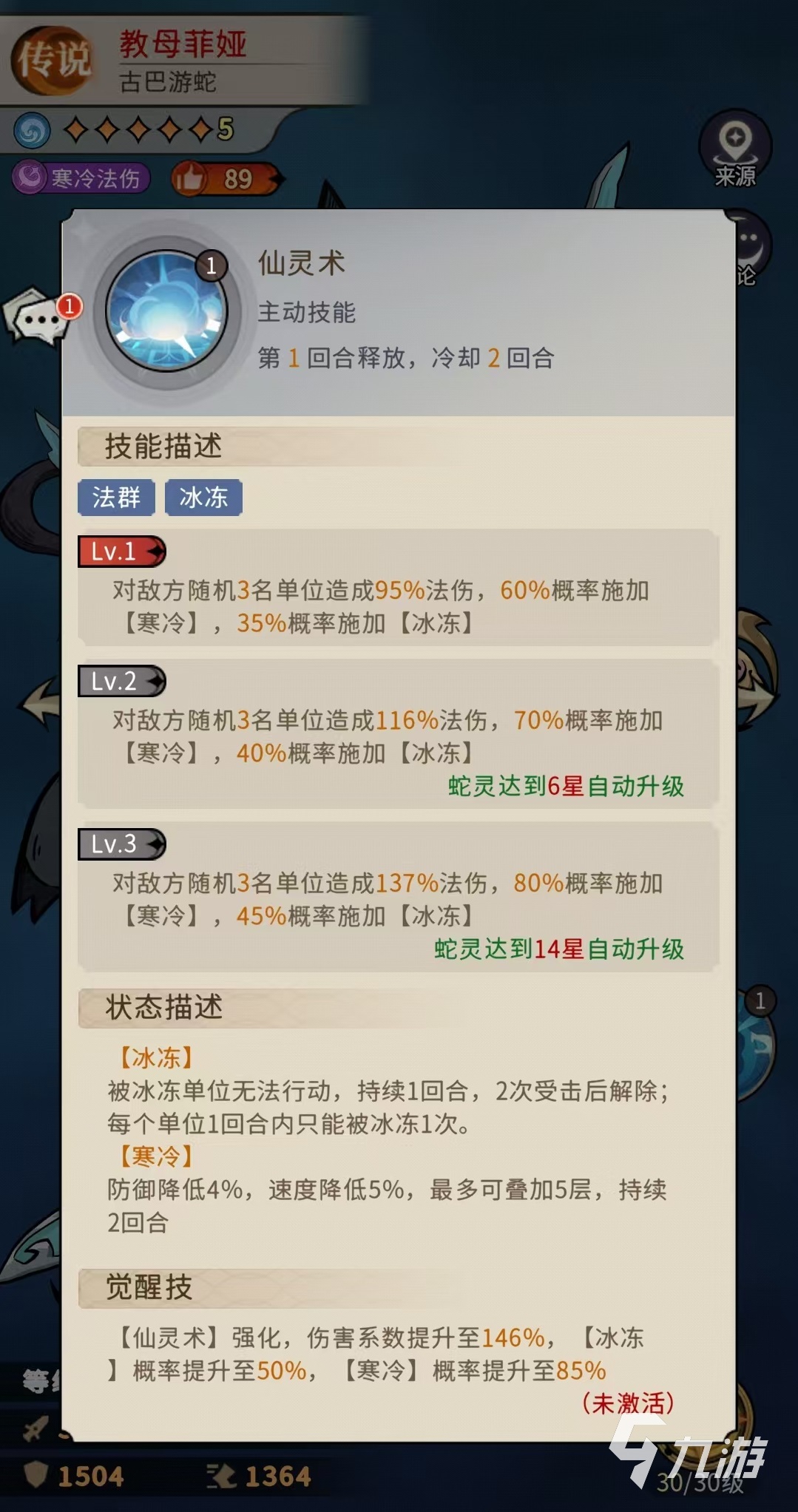教母菲婭的定位是法師職業(yè),它可以造成寒冷法術(shù)傷害。一技能仙靈術(shù),隨機(jī)選擇三個(gè)目標(biāo)附加法傷,有幾率施加寒冷和冰凍。該技能強(qiáng)化之后,傷害系數(shù)提升冰凍和寒冷的觸發(fā)幾率提升。對(duì)方被寒冷后防御降低,速度降低,最多疊加5層,被冰凍后持續(xù)一回合無法行動(dòng)。所以此技能的傷害尚在其次,對(duì)敵方造成的影響和控制才是最主要的。