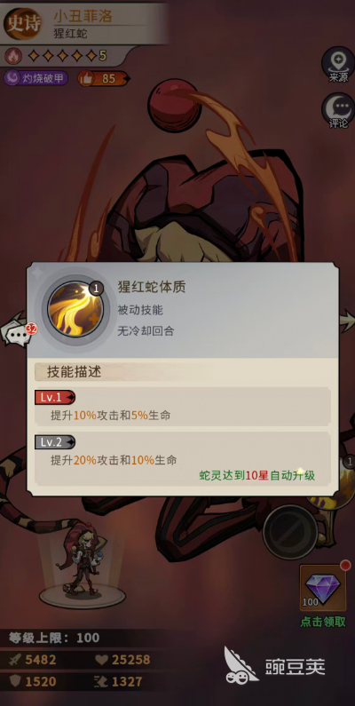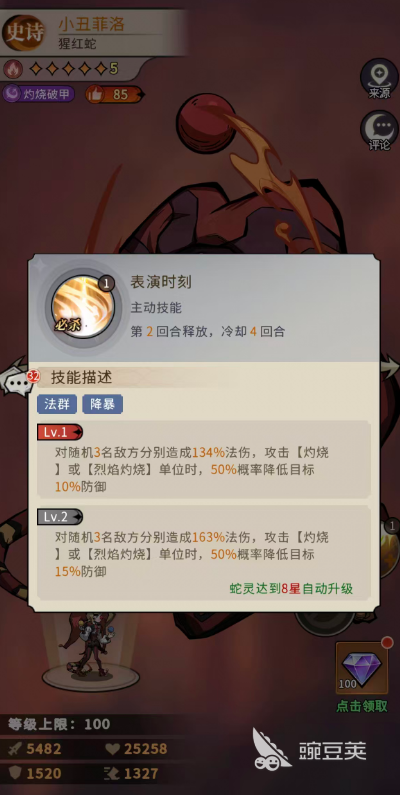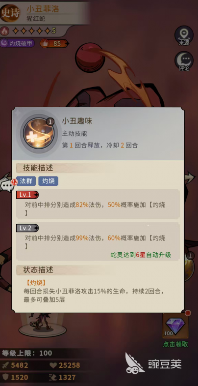 首先是小丑趣味這個(gè)技能,這是小丑菲洛的主動(dòng)技能,可以在第1回合釋放,就是需要冷卻個(gè)回合,才可以接著再次使用,其中是包含有法群灼燒的效果,可以對(duì)前中排分別造成82%法傷,所以在這里先手輸出可以覆蓋的范圍只是略過了后排而已,而且其中有50%概率可以施加灼燒,灼燒狀態(tài)的效果就是每回合損失小丑菲洛攻擊15%的生命,大家最多可以把這個(gè)狀態(tài)疊加到5層,此時(shí)失去的生命數(shù)值就換成了非常高的輸出數(shù)值,而且在蛇靈達(dá)到6星的時(shí)候他的技能就升級(jí)為對(duì)前中排分別造成99%法傷,60%的概率可以成功施加灼燒。