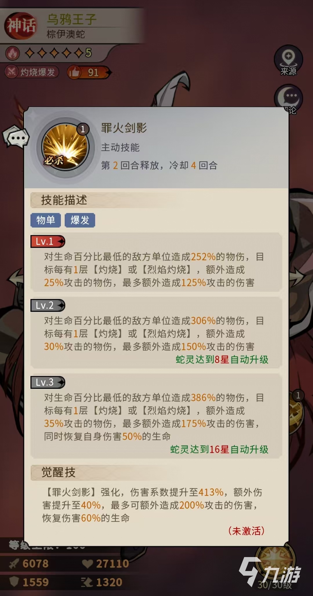烏鴉王子的技能特點(diǎn)是具有灼燒爆發(fā)能力,第一個(gè)主動(dòng)技能可以對(duì)敵方前中排造成物理傷害,有幾率施加灼燒,如果目標(biāo)血量低于半血,額外提升暴擊傷害。另外該技能在升級(jí)之后,對(duì)低血量目標(biāo)和帶有灼燒以及烈焰灼燒的單位,都有額外的傷害加成。對(duì)方被灼燒影響之后,每回合會(huì)損失烏鴉王子15%攻擊力的生命值,最多可以疊加5層。第二個(gè)主動(dòng)技能是對(duì)敵方生命百分比最低的目標(biāo)附加物理傷害,目標(biāo)身上帶有灼燒或者是烈焰灼燒層數(shù),都可以額外附加輸出,同時(shí)能夠恢復(fù)自身的生命值。
