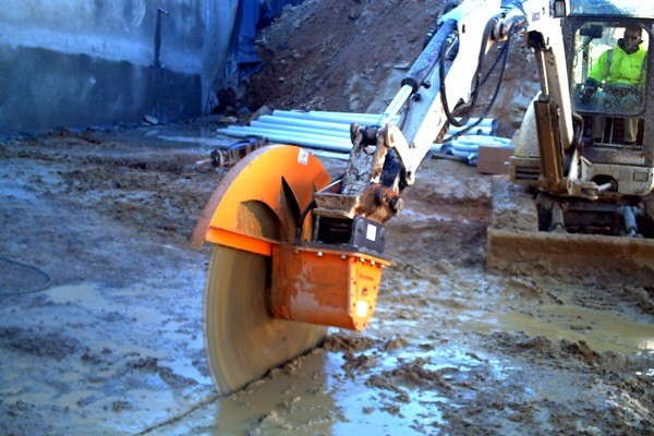 2014年8月,在甘肅敦煌一臺(tái)恩特ADS15RS巖石鋸安裝于VOLVO360挖掘機(jī)上,配備3米直徑的金剛石鋸片,正在切割花崗巖,鋸切深度為1.2米,每小時(shí)行進(jìn)速…