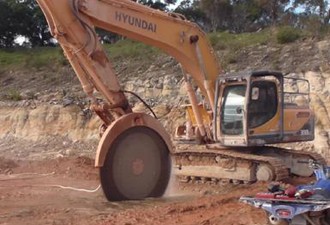 案例一2014年5月,在悉尼一臺恩特ADS20RS巖石鋸安裝于現(xiàn)代300挖掘機上,配備2米直徑的金剛石鋸片,正在切割礦石,鋸切深度為0.8米,每小時行進速度為20米 |
