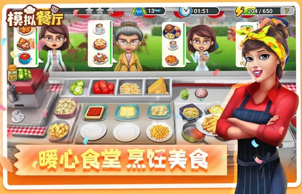 《模擬餐廳》游戲里面有全國各地的不同美食,玩家會在不同的地區(qū)通過餐車售賣美食,在每一個關卡中都會有不同的顧客前來購買食物,每一名顧客購買的商品不同,玩家要在最短的時間內為顧客制作好商品。在每一個關卡中也都會有相應的任務要求,完成任務之后會獲得獎勵,可以用來為廚房用品或者是菜品進行升級,通過升級會提升菜品的價格。