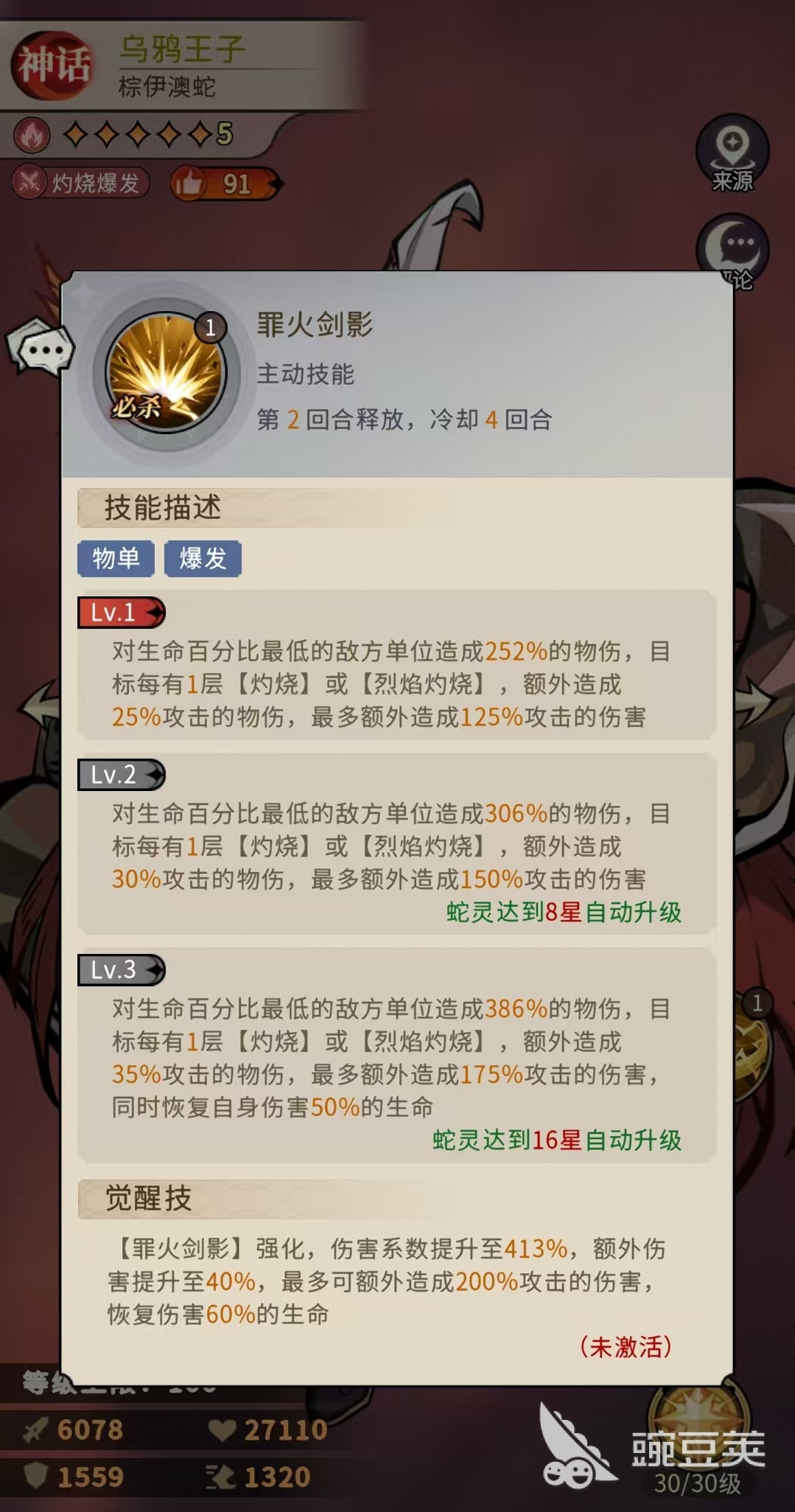 烏鴉王子的一技能具備雙重觸發(fā)邏輯:對(duì)敵方前排至中排單位施加基礎(chǔ)物理傷害,并有概率附加“灼燒”狀態(tài);當(dāng)目標(biāo)當(dāng)前生命值低于50%時(shí),該技能暴擊傷害提升;技能升級(jí)后,對(duì)已處于“灼燒”或“烈焰灼燒”狀態(tài)的目標(biāo),以及血量低于半血的單位,均追加額外傷害。被施加灼燒的目標(biāo)每回合將損失相當(dāng)于烏鴉王子15%攻擊力的生命值,該效果最多可疊加5層。